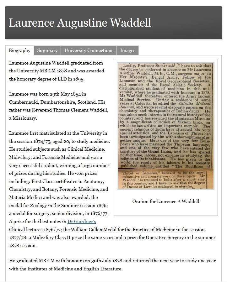Laurence Austine Waddell was awarded an honorary degree of LLD in 1895, the reason for his award being his work as Surgeon-Major in the Indian Medical Service, Bengal. I have attached a copy of his oration (our ref IP6/1/4 pg1):
