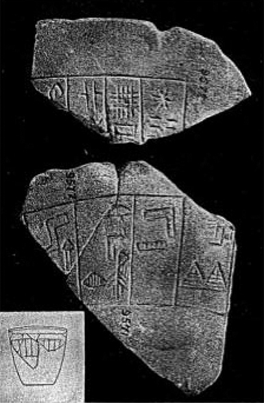 Fragments of the bowl of Utu(k) unearthed below the foundations of a temple at Nippur by the Pennsylvania Museum Expedition, dated c.3,247 BC. The fragments were in Waddell's possession but were donated to the British Museum in 1939. AN0050446001 Reg no. 1939 0612. 2, reproduced with kind permission from the Trustees of the British Museum (Sept 15, 2008).