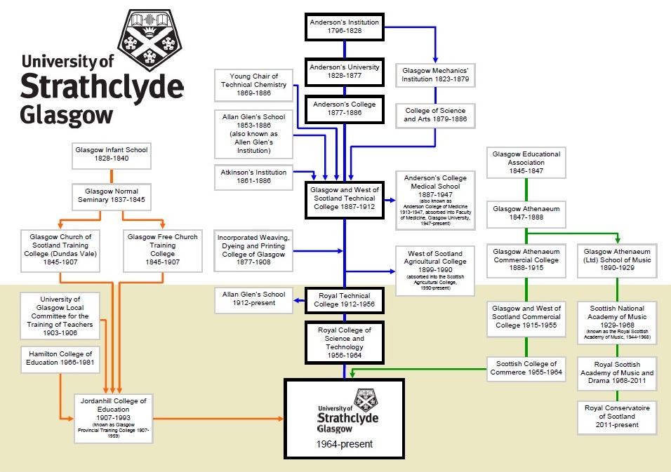 The College was officially called the Glasgow and West of Scotland Technical College, the full grandeur of whose antecedents and subsequent evolution is most authoritatively captured in this pictorial chart reproduced from the University of Strathclyde archives: