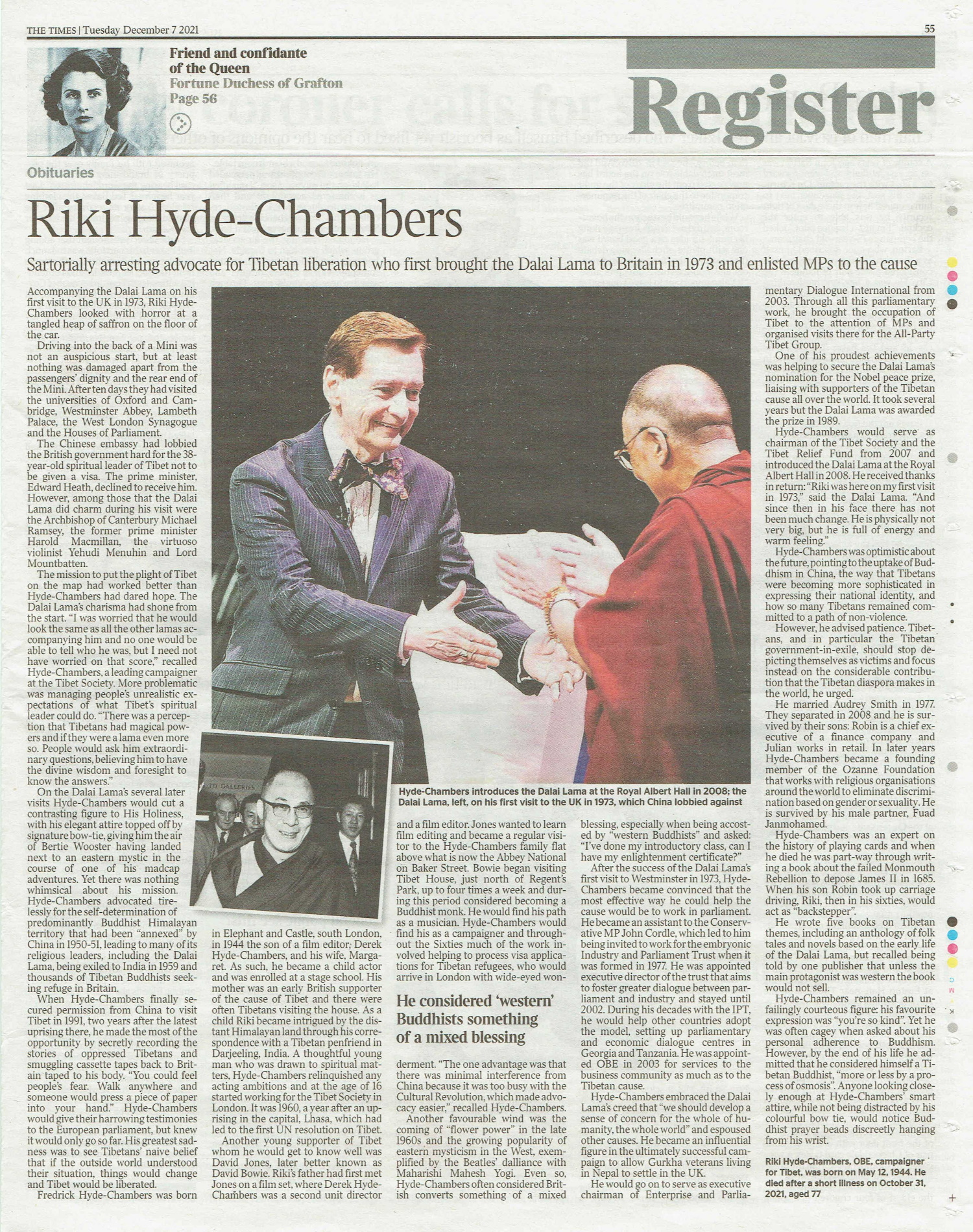 (7 Dec 2021) The death has just been disclosed of Frederick (Riki) Hyde-Chambers, who has been a great friend not only of the Tibetan people in general, but also of their spiritual leader HH the Dalai Lama in particular. Please click here to see his obituary (or here for pdf copy) and here for the wider context.