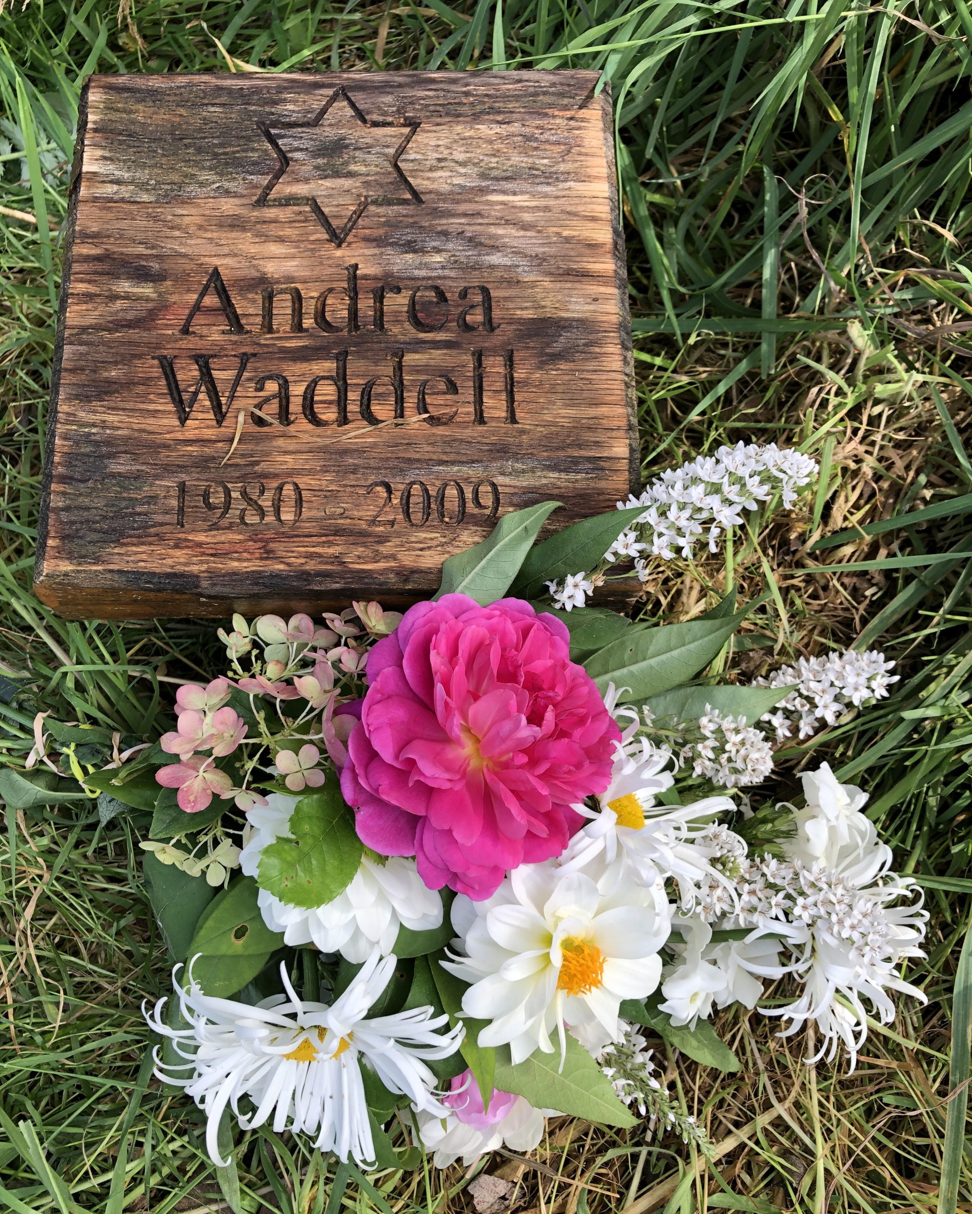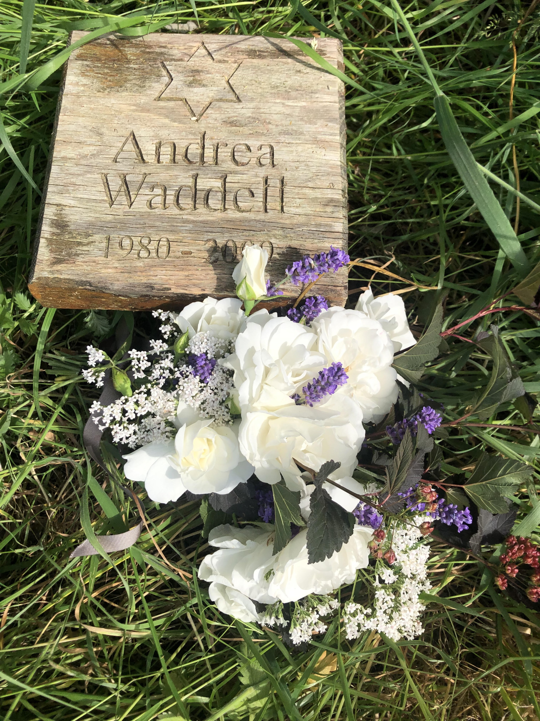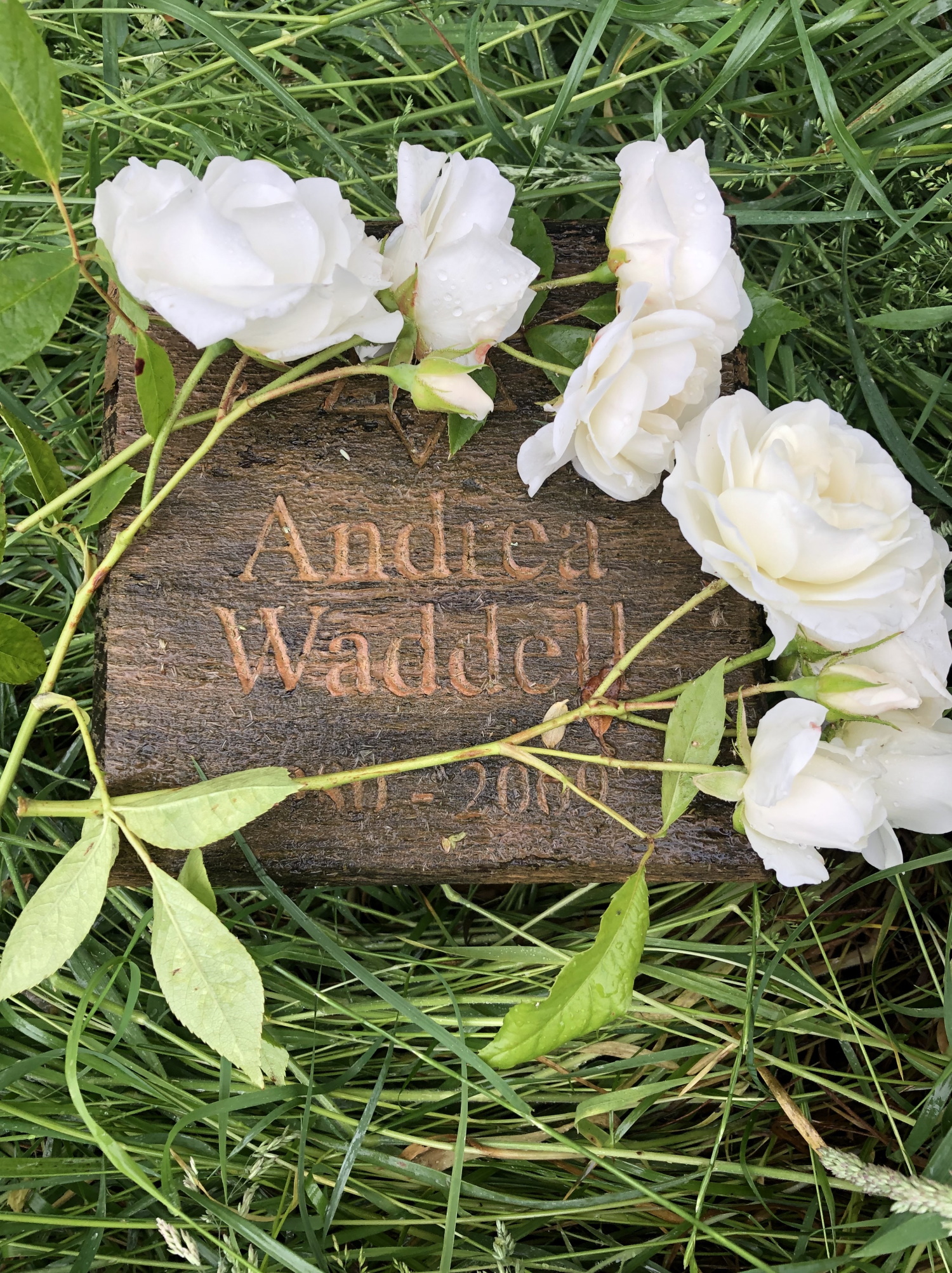 (18 Jun 2021) Sincere thanks to a very kind friend for arranging this memento of our daughter Andrea's birthday despite a heavy downpour! And in a further act of great kindness they have also renovated her memorial plaque.