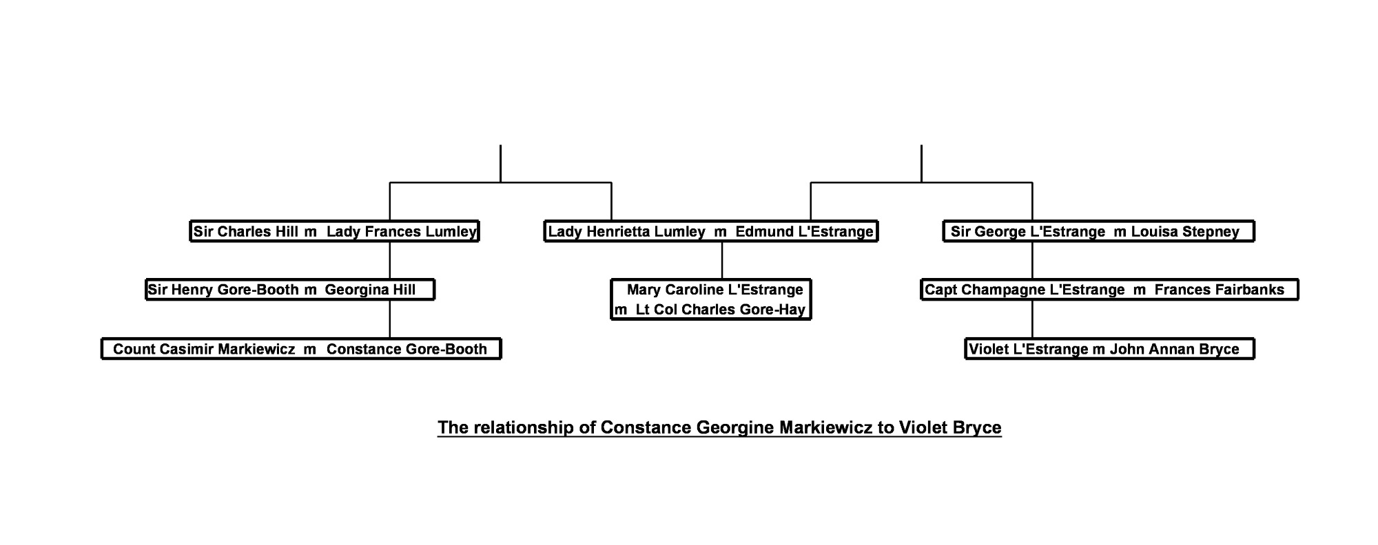 Click here to grapple with the patriarchal tables, and here to see a diagrammatic summary, but the bottom line is that Violet Bryce's great-uncle Edmund L'Estrange was married to Constance Markiewicz's great-aunt Henrietta Lumley-Savile, a remote connection indeed. Violet and Constance might well have been documented in military intelligence dossiers simply as "cousins", however.