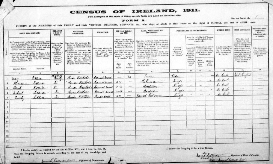 We see that Mary Sullivan, a widow of 73, was described as a farmer – implying that at least some of Garinish was fertile enough for family self-sufficiency. Her four sons – Florence (54, fisherman), Patrick (52, boatman), Michael (49, boatman) and Timothy (30, labourer) – were all single, not altogether surprisingly, as men in rural Ireland right up to a generation ago adhered to the age-old tradition of waiting until they were economically independent (by inheriting the family farm or fishing boat, for example) before entering into marriage – their wives might well be 20 or 30 years younger than them.