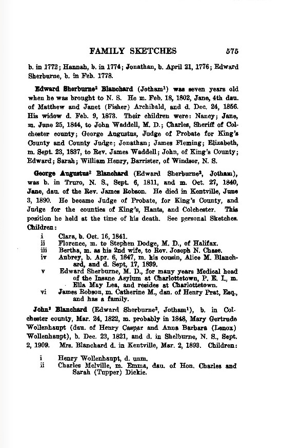 John Blanchard (b ~1767) Sarah Blanchard (b ~1769) = Jacob Lippencott Elizabeth Blanchard (1770 – 25 Sep 1808) = Nathaniel Symonds Rebecca Blanchard (b ~1772) = Mr Shepard Hannah Blanchard (b 1774) (m 1799) = David Archibald Jonathan Blanchard (21 Apr 1776 – 31 May 1843) Edward Sherburne Blanchard (Feb 1778 – 24 Dec 1856) Nancy Blanchard (~1780 – 18 Aug 1818) = Rev John Waddel (10 Apr 1871 – 13 Nov 1842) (m 2 Sep 1802) |