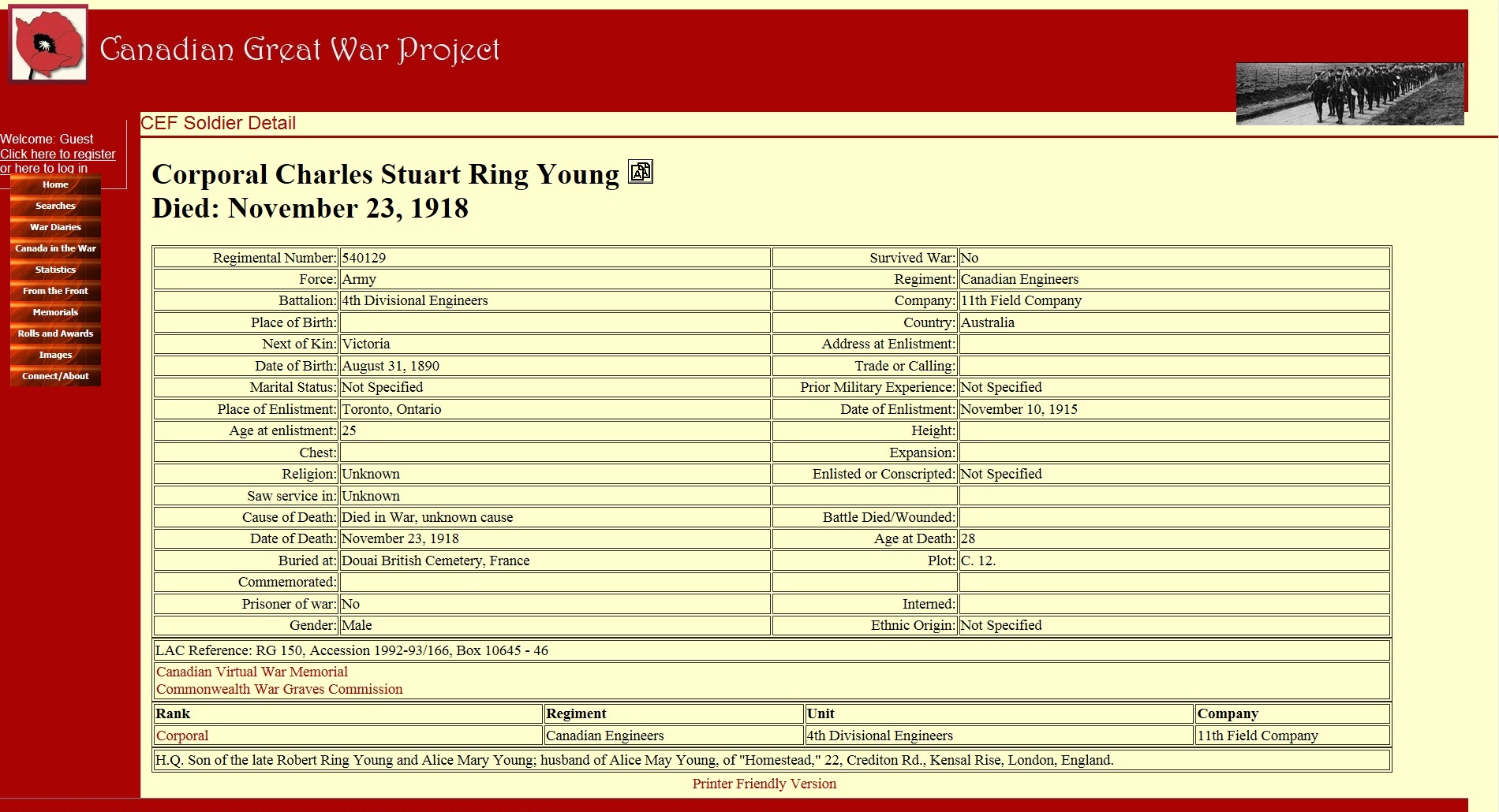 Charles Stuart Ring Young1, 2, 3 (31 Aug 1890 – 23 Nov 1918, died of wounds received in action pre-Armistice) (m 21 Nov 1917) |