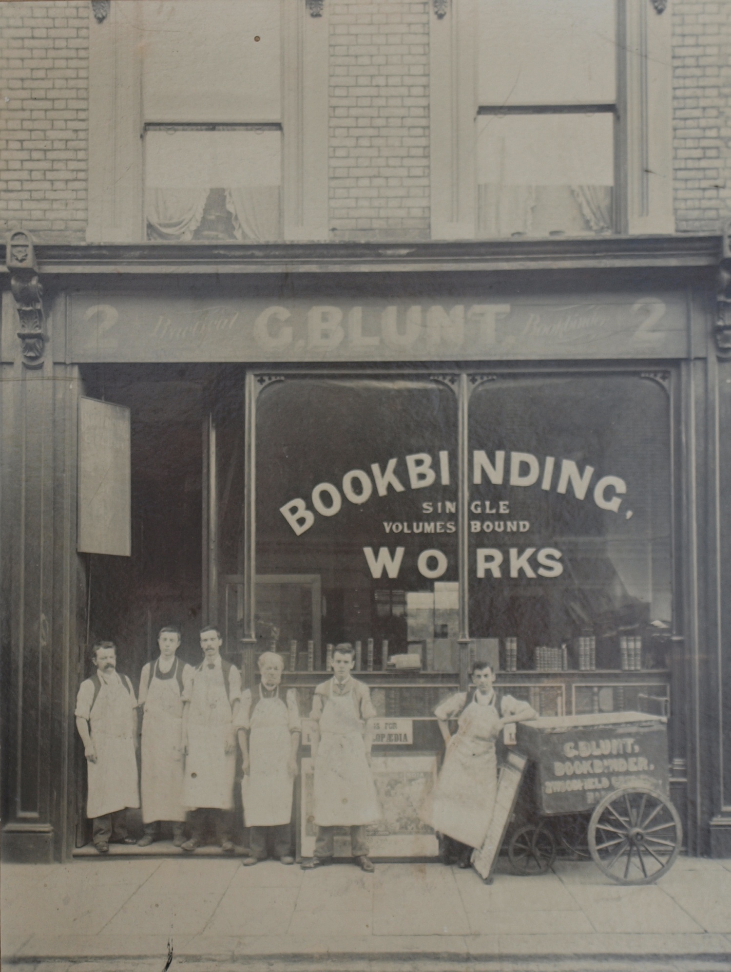The first family record of the Blunt bookbinding dynasty is the indenture of fourteen year old George Blunt (1824-1897, our great great grandfather), being apprenticed in 1838 for seven years to bookbinder John Cooper in Birmingham. He then practised as a bookbinder and married Selina Hounslow in 1849; they had a daughter and four sons. It was he in 1879 who founded G Blunt and Sons, based in Paddington, London and later in Kilburn Lane, Queens Park.