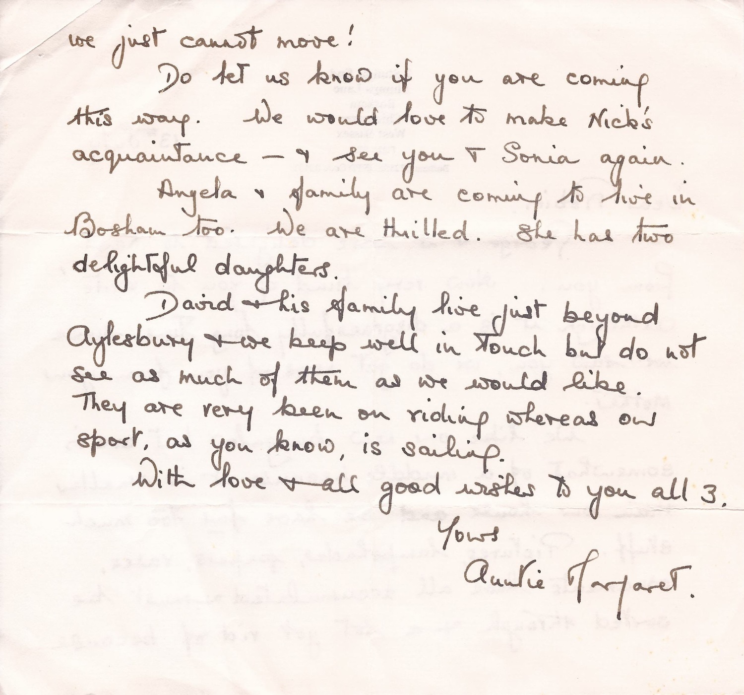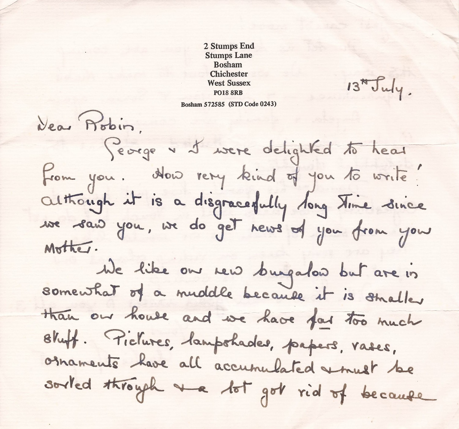 The decades passed, indeed accelerated, as they so often do, and Margaret wrote to say that she and George had relocated from Pinner to Bosham. Exactly when, though, I can't work out, as like so many of her sex she didn't date her letter. But what a nice cheery one it was.