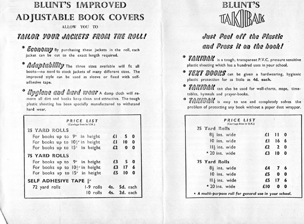 He recounts that every Christmas his wife puts brown paper round the outside of her Christmas cake tin, using an old roll of paper which was left behind by his aunt when she died in 2003. The roll is a combination of brown paper and plastic – his wife has to separate the two. This year she happened to note inside some instructions for using the paper/plastic to cover books – how to tailor your jackets from the roll using "Takibak". There is also a price-list with prices in pounds, shillings and pence.
