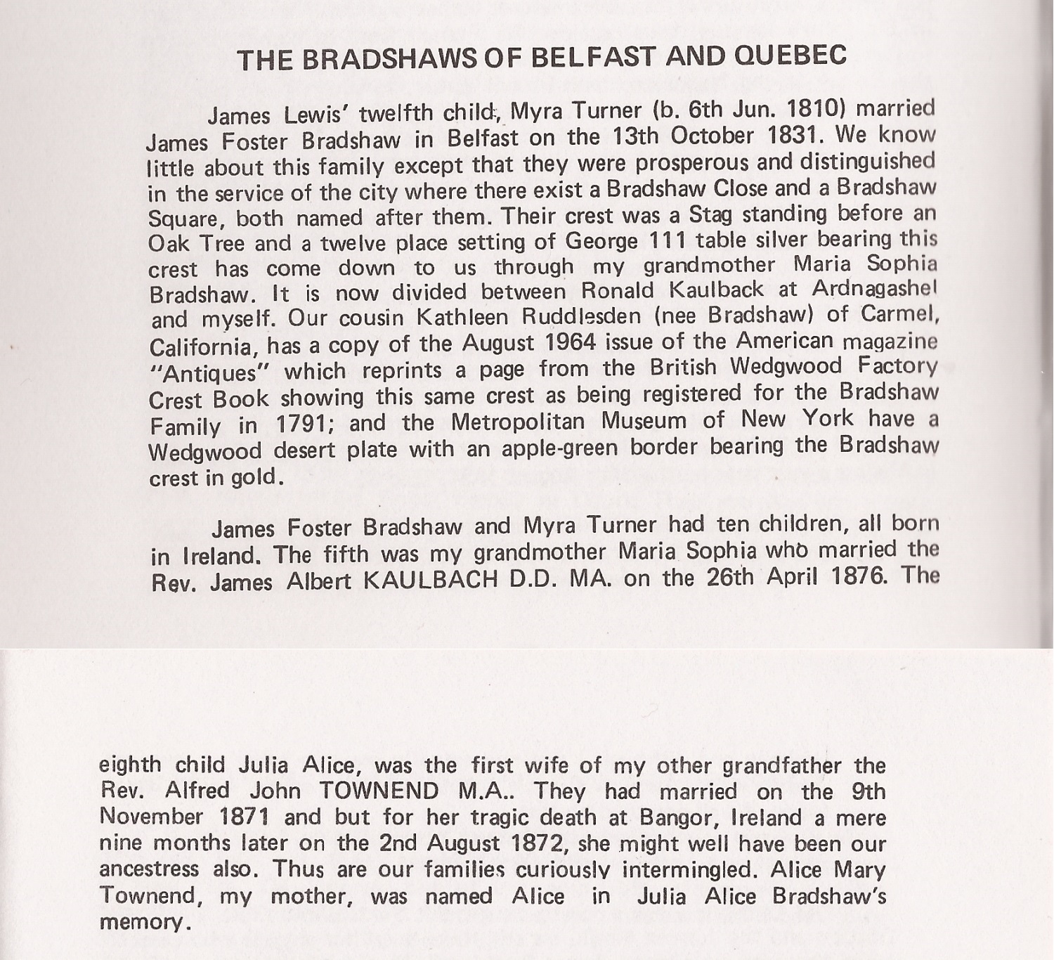and initiate the nitty-gritty with a very helpful family tree reproduced from the website bradshaw-ulster.co.uk/index.htm (note that this was a branch of the very distinguished and long-established Lancashire family of that name):