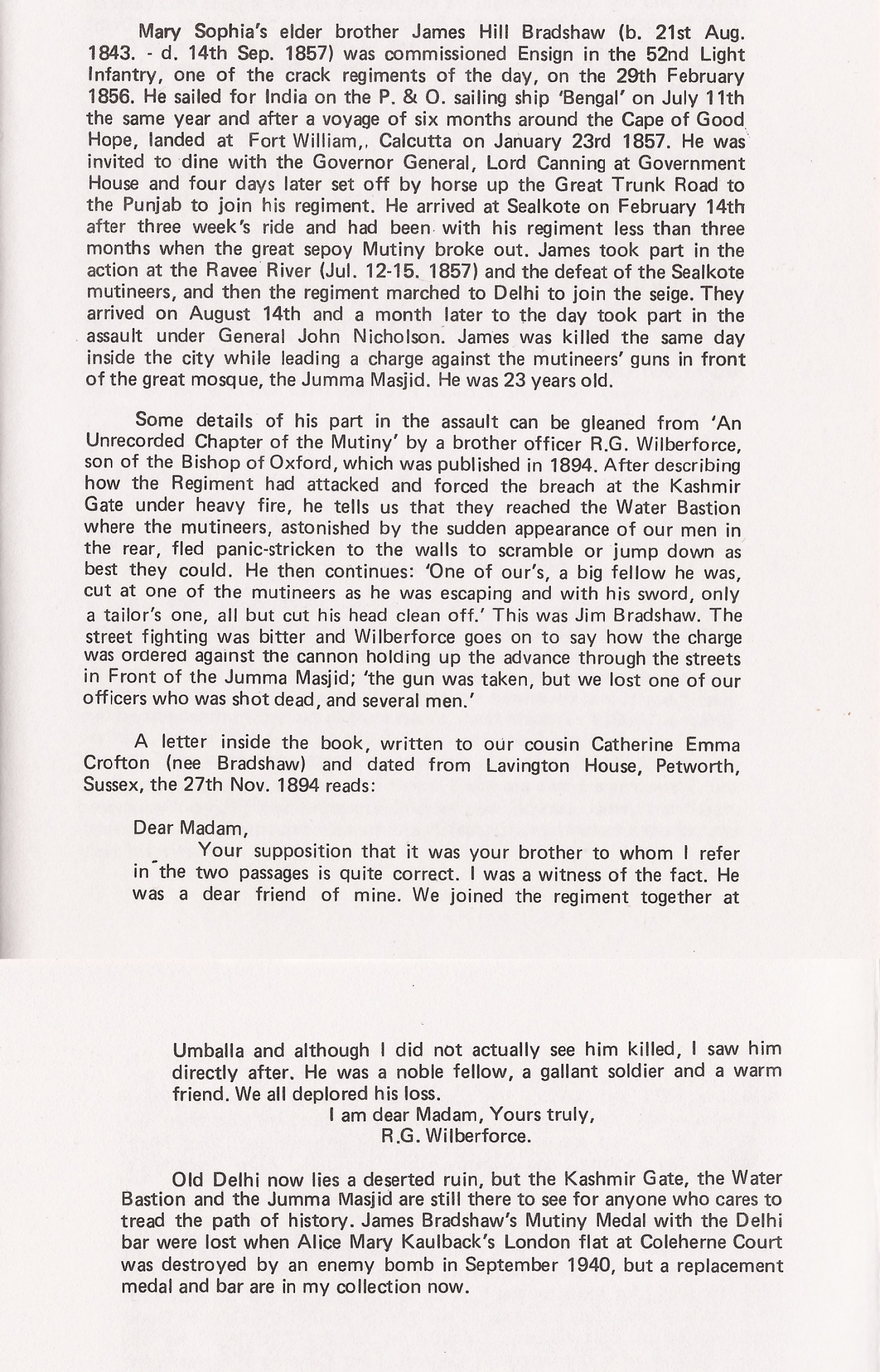 Myrha Harriet Bradshaw (bapt 7 Jul 1833) Lt James Hill Bradshaw (21 Aug 1834 – bapt 16 Sep 1834 – KIA 14 Sep 1857) Elizabeth Maria Bradshaw (bapt 18 Feb 1836) James Lewis Bradshaw (b 24 Sep 1837) Emma Katherine Bradshaw (d Nov 1920) Florence Margaret Bradshaw (ca 1850 – 3 Apr 1918) Julia Alice Bradshaw (d 2 Aug 1872) Mary Sophia Bradshaw (20 Apr 1856 – 5 May 1912) |