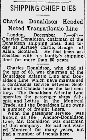 The following extract gives an exceptionally clear and complete account of the origins of the Donaldson shipping empire (1855-1968) and the family members who ran it, tying in very neatly with the family tree already deduced from other sources: