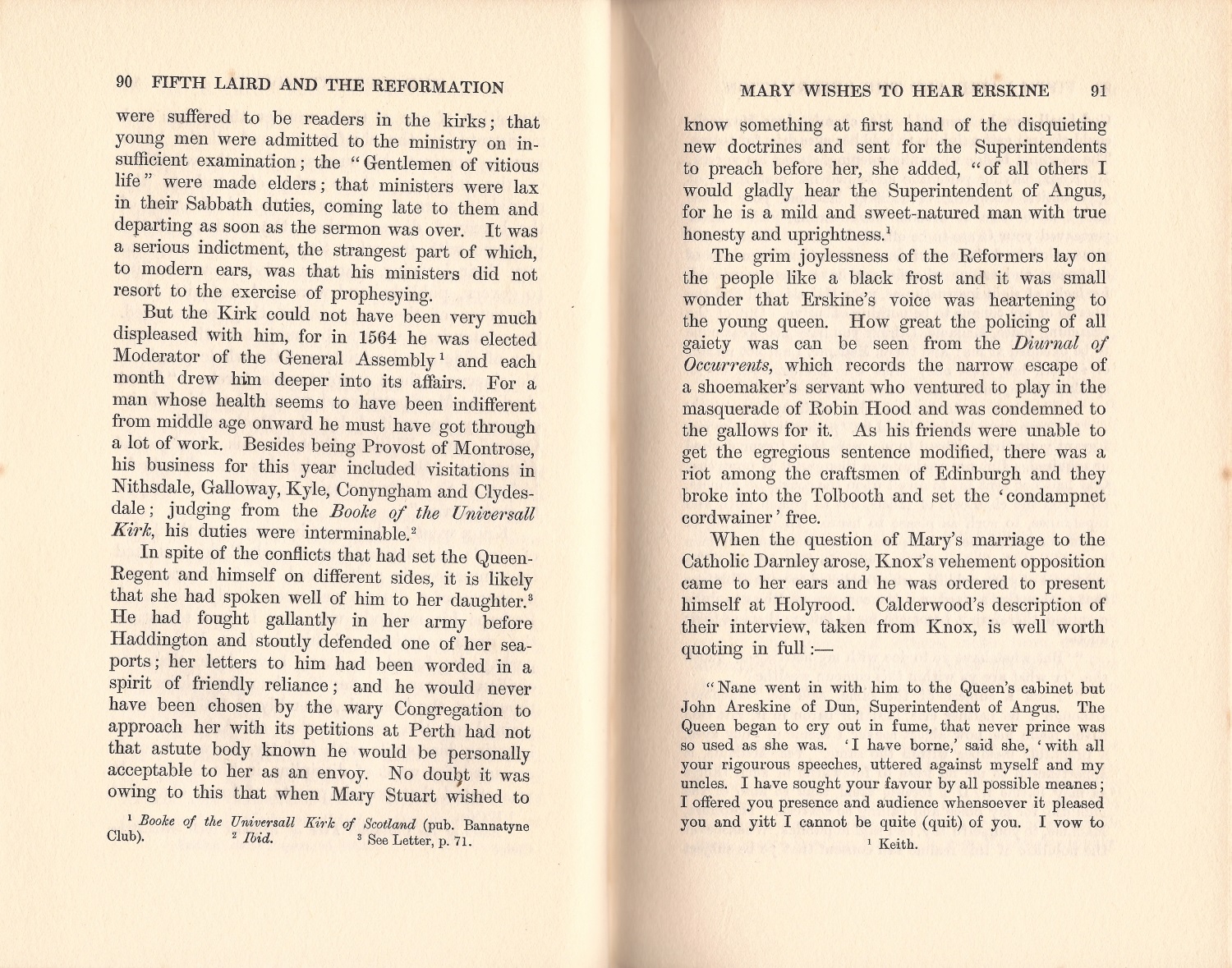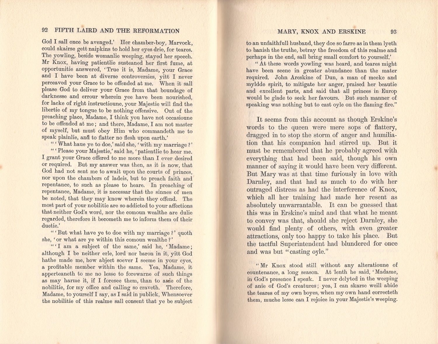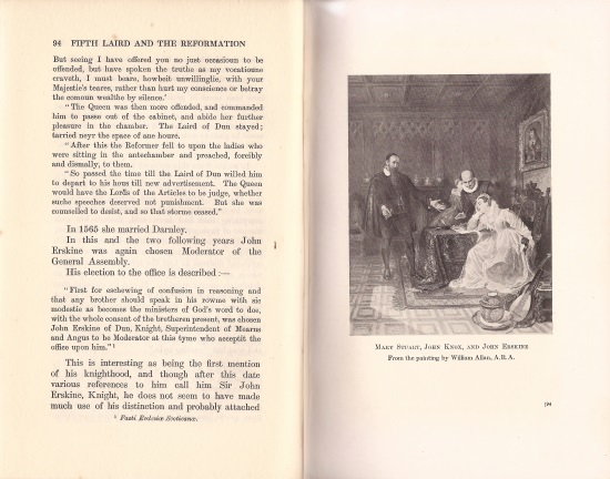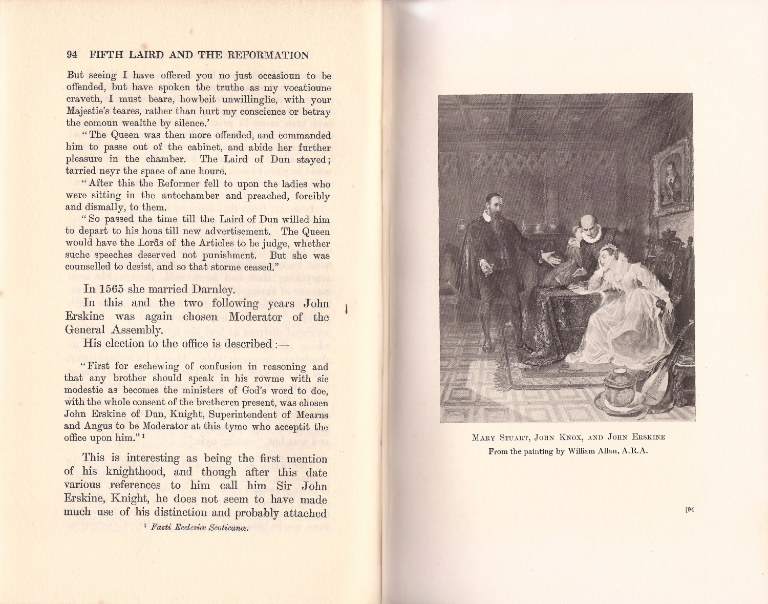 But she summoned him on several occasions to appear before her at Holyrood to explain his latest outbursts of criticism. The occasion described on pp 91-94 of The Lairds of Dun is undated, but Violet Jacob says it was in connection with Knox's opposition to her proposed marriage to Darnley, a Catholic. The Wikipedia article, clearly describing the same encounter, on 24 Jun 1563, mentions Don Carlos, the son of Philip II of Spain, rather than Darnley. Be that as it may, the episode is enthralling (and I particularly like the bit where he preached "forcefully and dismally" to her Ladies In Waiting in the antechamber afterwards). Notice also the mediating influence of our hero: "John Areskine of Dun, a man of meeke and myllde spirit, to mitigate her anger, praised her beautie and excellent parts" – that would sound a bit creepy these days, and indeed it only inflamed her further!