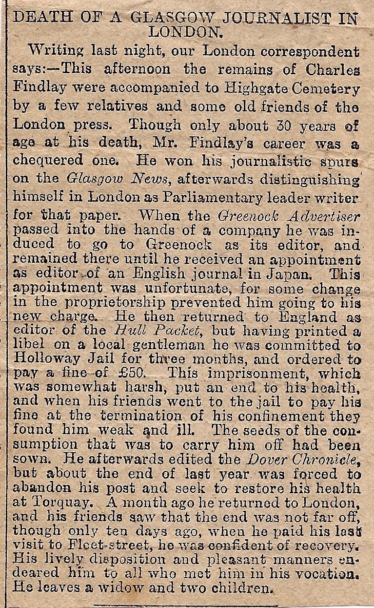 Whether this was before or after their father Charles Findlay's death in 1883 I don't yet know. But it was around that time that he was written-out of the family script, and ceased even to be mentioned within the Findlay family. He was treated as though he had never existed.