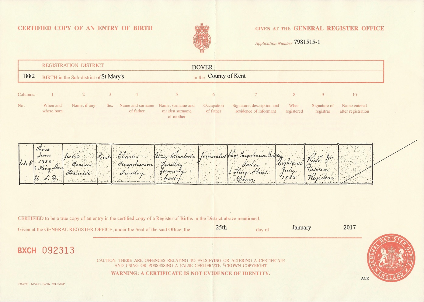 | ‑2 | Jessie Frances Hannah Findlay (3 Jun 1882 – 12 Jan 1974) |