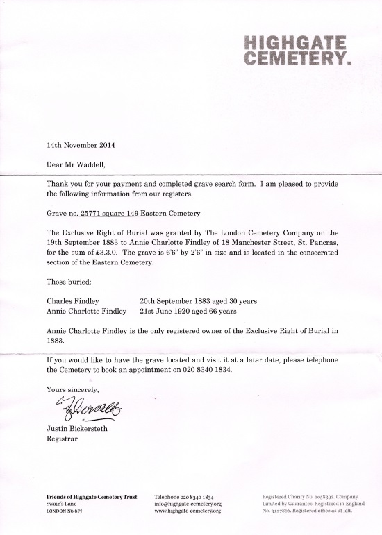 This account of Findlay's removal to the cemetery was clearly written at some point between his death on 15 Sep 1883 and his interment on 20 Sep 1883 as per the letter reproduced below.