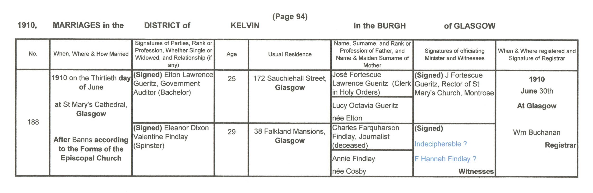 John Elton Fortescue Gueritz (8 May 1911 – 24 Oct 1975) Lucy Valentine Gueritz (12 Aug 1915 – 1993) Eleanor Elton Gueritz (7 Nov 1916 – 1990) Edward Findlay Gueritz (8 Sep 1919 – 21 Dec 2008) |