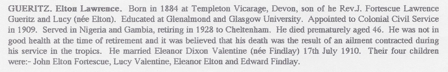The two countries in which he served as colonial auditor were part of the notorious Fever Coast, or White Man's Graveyard, the death-sentence for Saki's Comus Bassington. Gueritz was relatively fortunate to have at least survived, albeit with broken health.