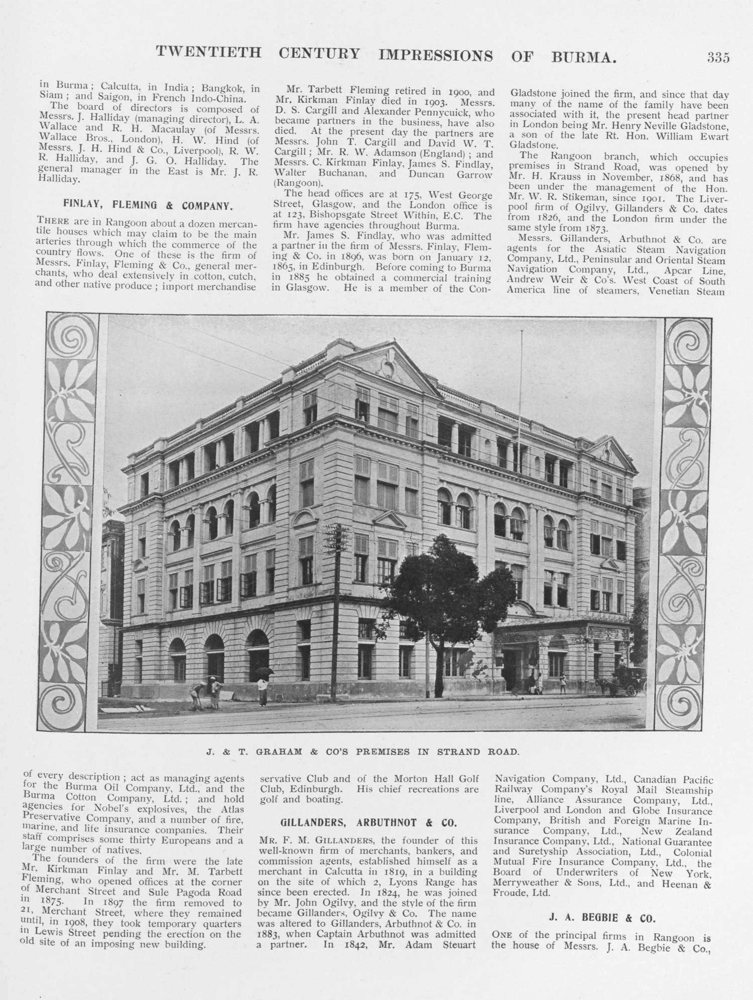 "Mr James S Findlay, who was admitted a partner in the firm of Messrs Finlay, Fleming & Co in 1896, was born on January 12, 1865, in Edinburgh. Before coming to Burma in 1885 he obtained a commercial training in Glasgow. He is a member of the Conservative Club and of the Morton Hall Golf Club, Edinburgh. His chief recreations are golf and boating."
