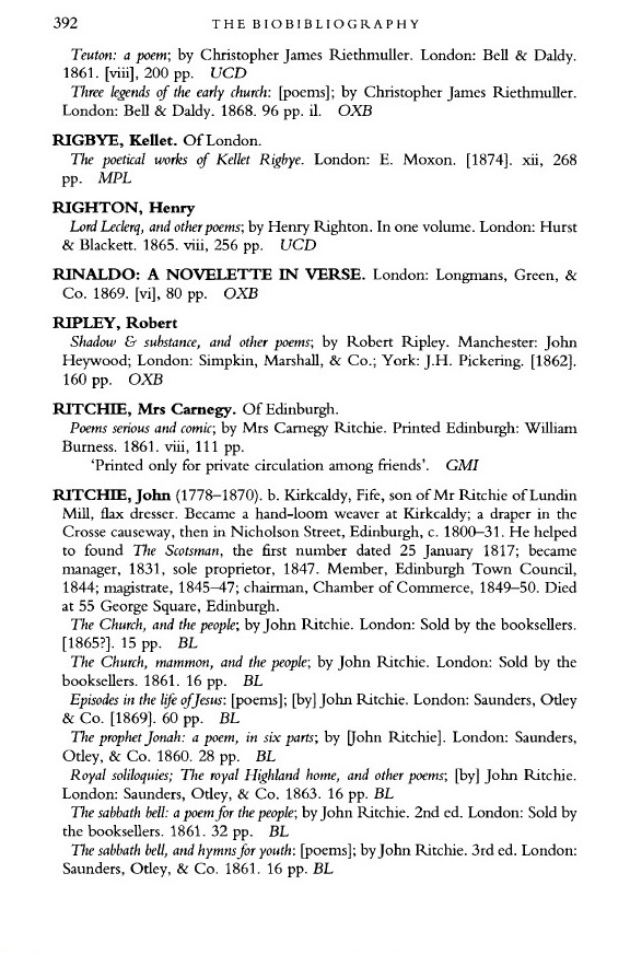John Ritchie encouraged the appearance of poems by the young Isa Craig (1831-1903) in The Scotsman and when these were collected in her first volume, "Poems" (1856), he was the dedicatee. From 1860 onwards, he began to publish poems of both a religious and patriotic tendency. Among the former were The Life of Jonah the Prophet (1860); The Church, Mammon, and the People (1861); a Sabbatarian plea, The Sabbath Bell, A Poem for the People (1861); and the biblical verse drama, The Captive Maid, Dramatised (1868).