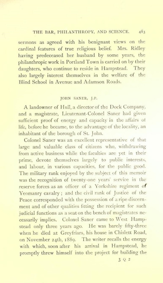 Following the shameful episode of the trial and imprisonment of Charles Findlay in 1880, Saner quailed in the face of popular local hostility and eventually fled south to Hampstead in 1886, where to some extent he redeemed himself, though improperly continuing to present himself as a Lieutenant Colonel!
