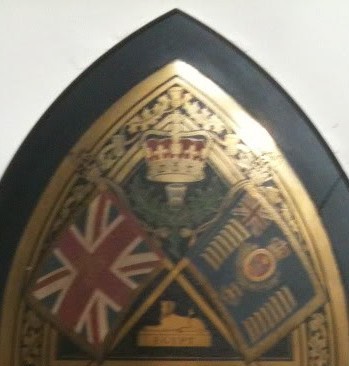 The upper part of the arch has various insignia and decorations. A central crown with thistle leaves below. rossed flags on standards. One is a Union Jack. The other is the Kings Colours of Queens Own Cameron Highlanders. A Sphinx with the word EGYPT below the flags. This was a battle honour for the regiment.
