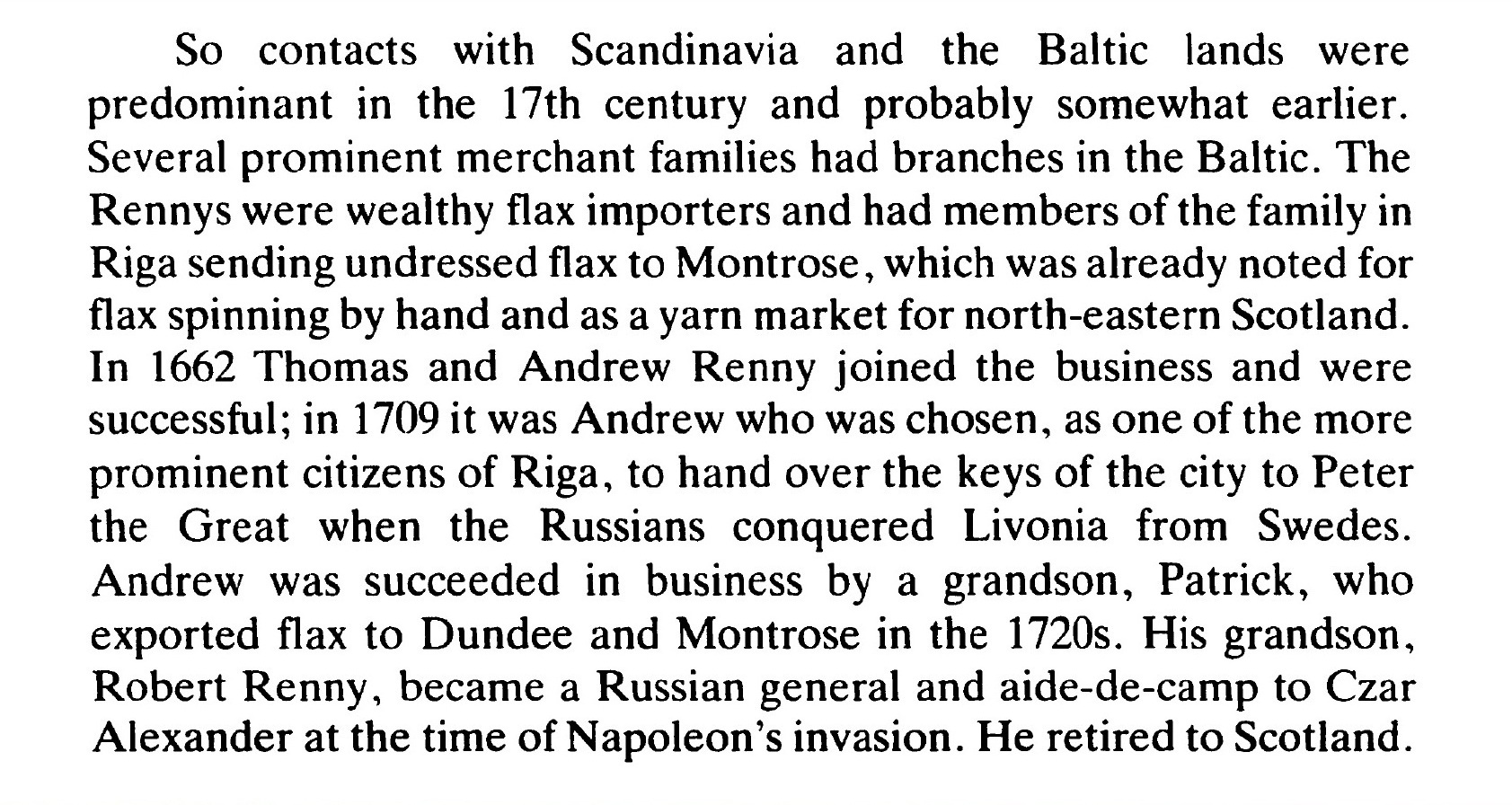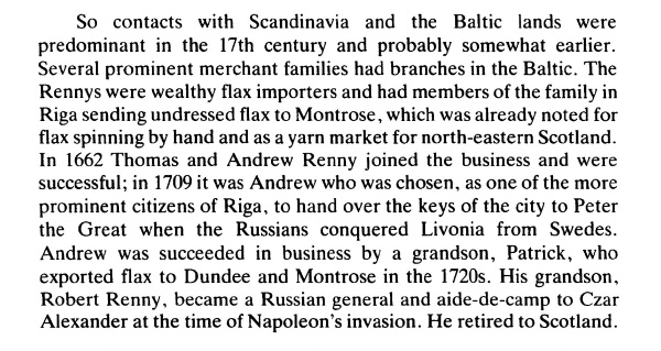 The family of my mother – RENNY, of the Montrose and Usan areas, were engaged in the flax trade, certainly from the late C17th. onwards.