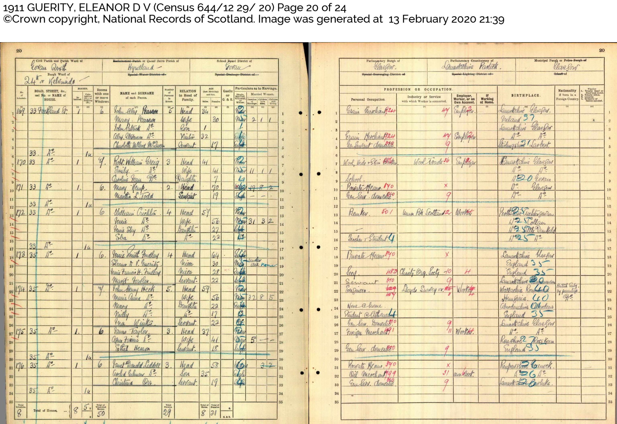 The 1911 Census information tells us that (quite surprisingly), Aunt Jessie, Val and Hannah now lived jointly in a single household (35 Falkland Street in the Govan area of Glasgow), possibly financed largely from Aunt Jessie’s private means that are mentioned. Hannah was in paid employment as secretary for a charity, and presumably Val, as a married woman, had some sort of housekeeping arrangement with her husband Elton (who was working abroad in the colonial civil service).