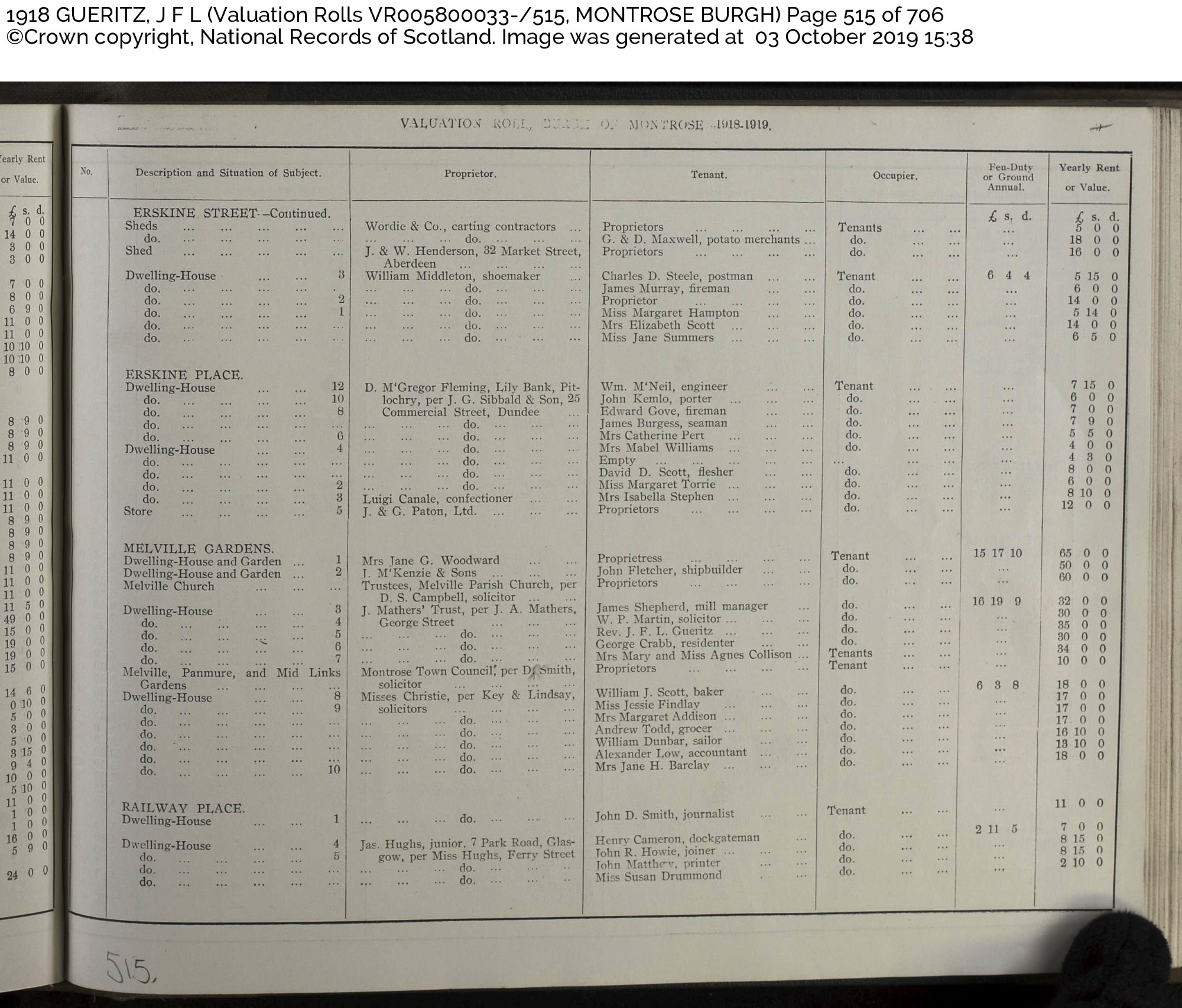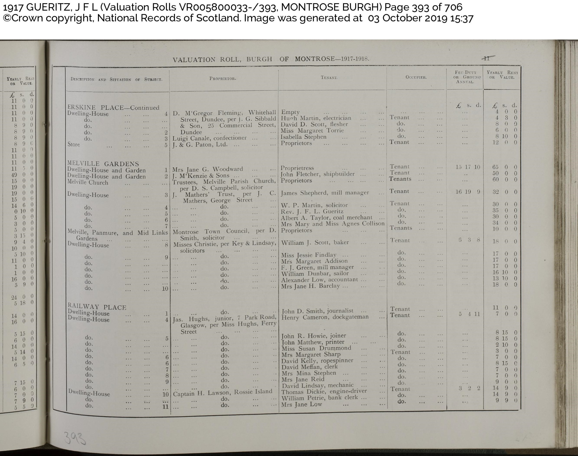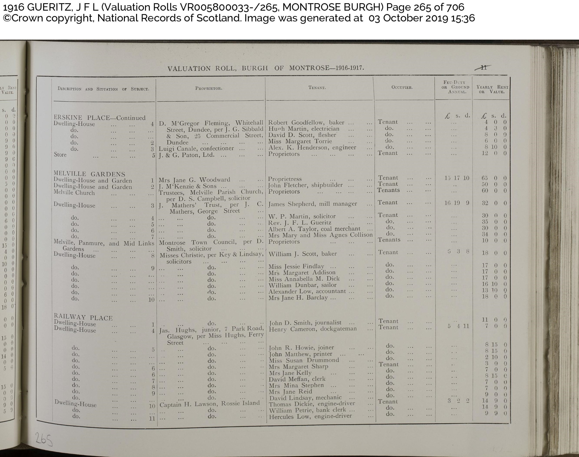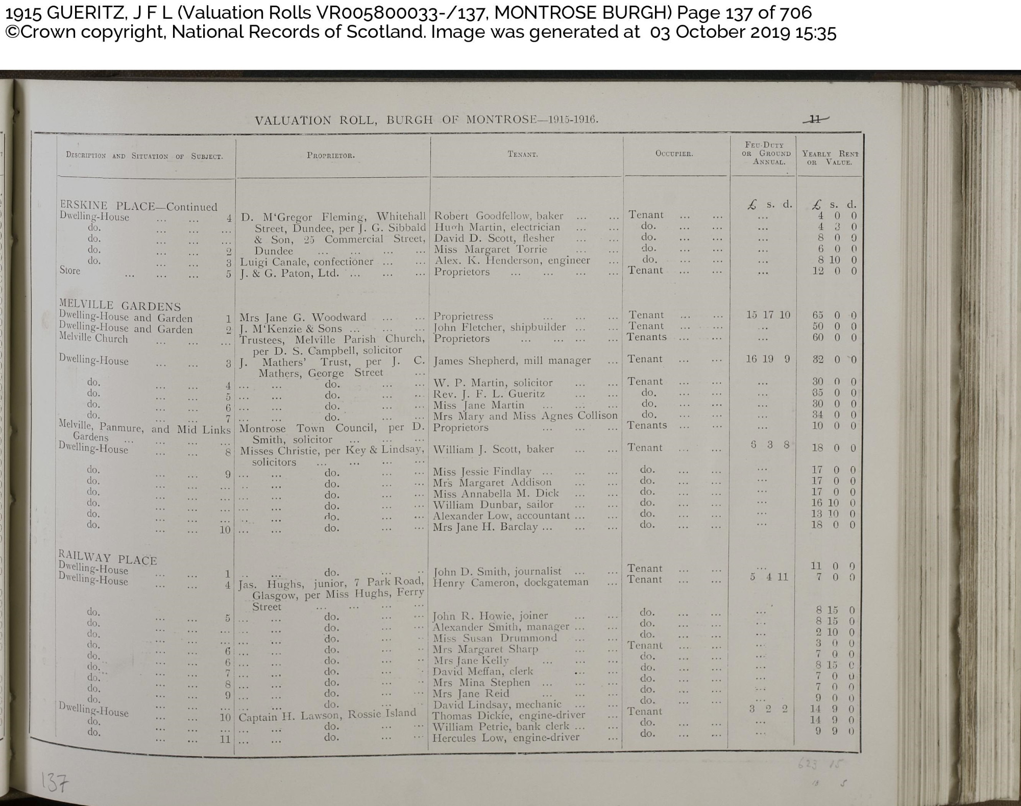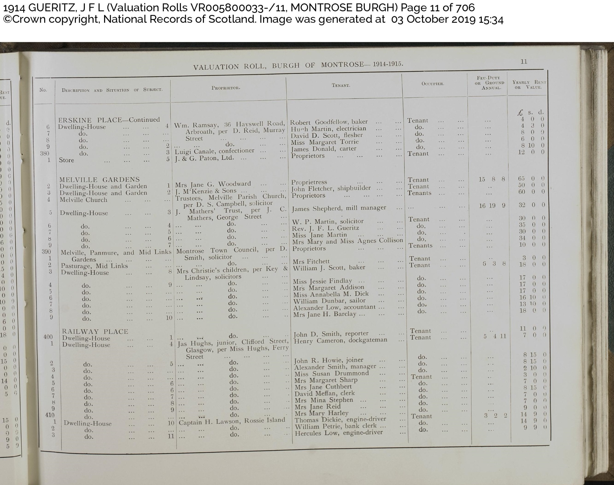 The occupant of 5 Melville Gardens, though, is recorded as the Rev J F L Gueritz (aka Fortescue) who was the Rector of St Mary and St Peter, Montrose (1909-1916). His wife Lucy had died in Sep 1915, and I’m not sure how he could have coped with the influx of a daughter-in-law and (progressively) three small children. He was evidently a very kind unworldly chap, by all accounts, but this was verging on the saintly.