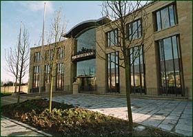 By 1999 the old, Gothic building on North Bridge, with its labyrinthine corridors and 13 floors, had become an inadequate home for a modern newspaper. The Scotsman, Scotland on Sunday and the Evening News moved into a purpose-built, up-to-date building at Holyrood, in the imposing shadow of Salisbury Crags. The building's soaring atrium allows as much natural light as possible to spread over all three floors, with largely open-plan accommodation for a staff of about 600 leading directly from it. It is very different from the warren of offices in the old North Bridge building, and allows the grouping of common departments that were sometimes separated by several floors in the former head office.