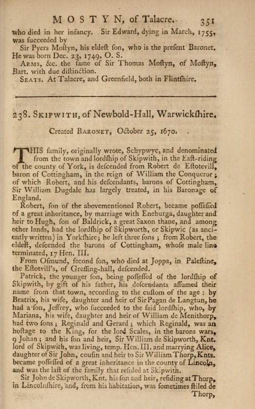 Edward Kimber and Richard Johnson, editing and extending an earlier work by Thomas Wotton, published in 1741, picked up the story in detail, starting from Robert d'Estouteville, Lord of Cottingham [III] (?1040 -?1107):