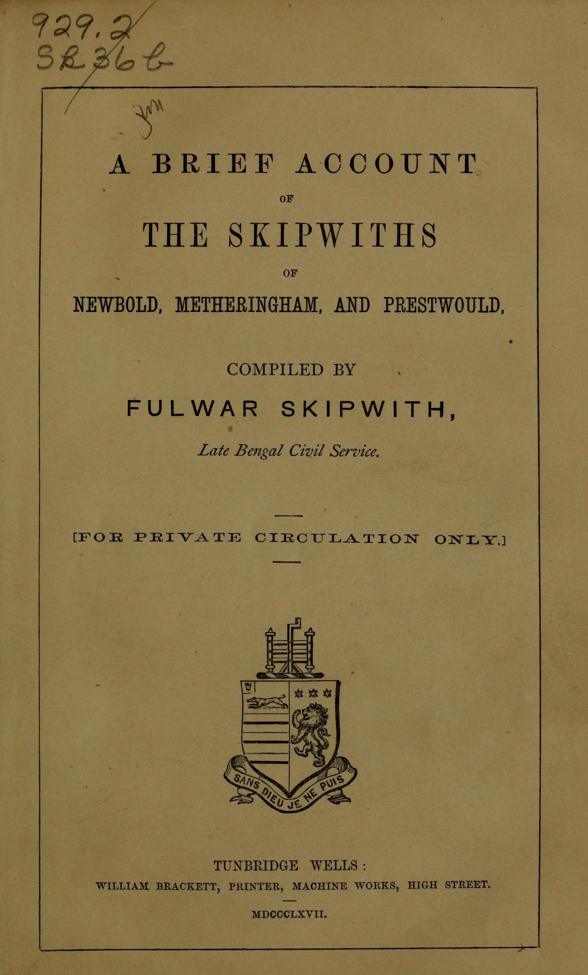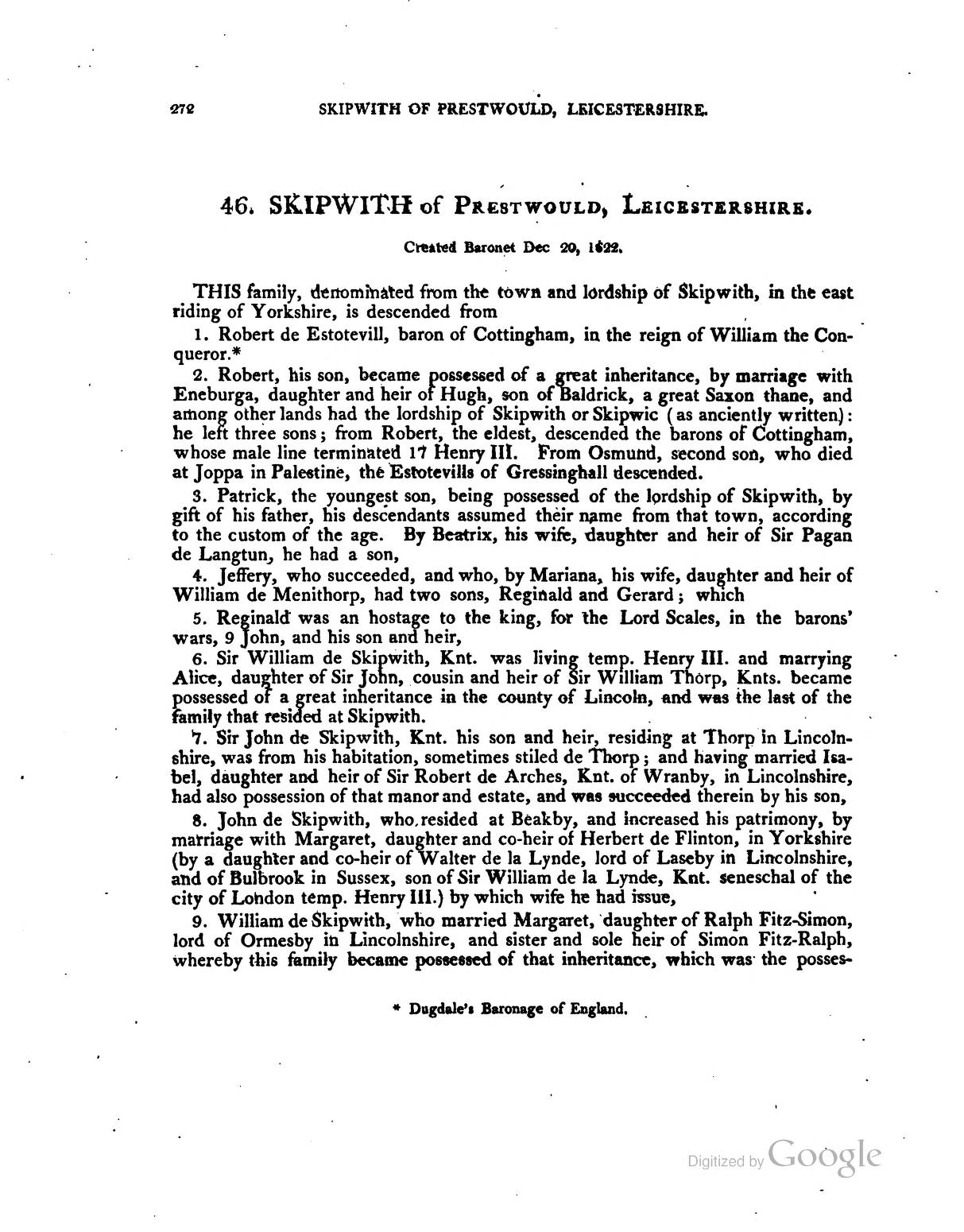 By far the most readable of the Skipwith histories is that of 1867 by Fulwar Skipwith (18 Feb 1810 – 22 Jun 1883), one of the "Heaven-born" of the ICS. He begins with Robert le Grandbois d'Estouteville, and quotes a number of sources to the effect that Robert was acclaimed by for his prominent role in the Battle of Hastings. This may well be true, but doesn't seem to be substantiated by the "List of Proven Companions" which is defined as those whose active participation in that unhappy day for England is established beyond doubt.
