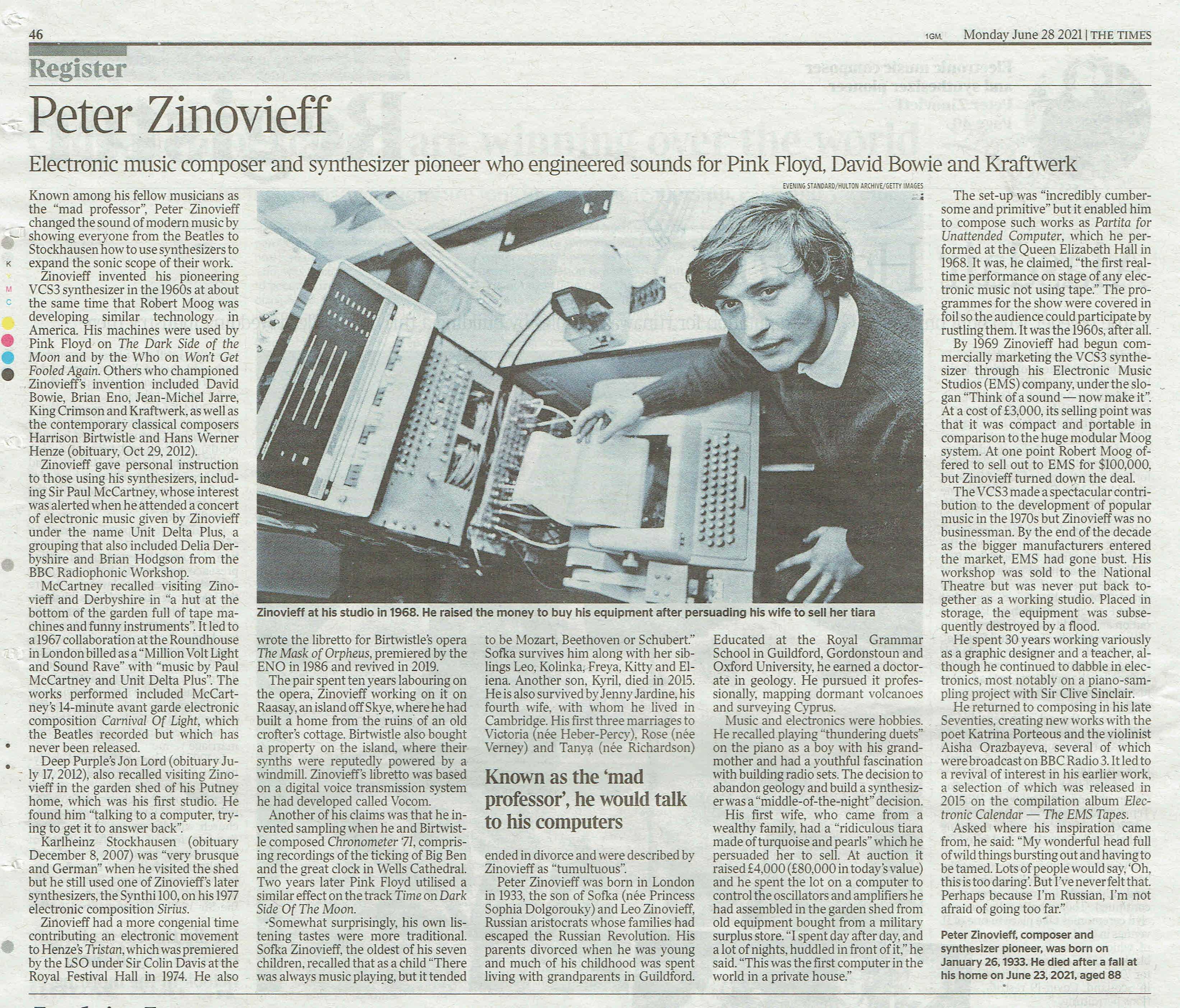 | 0 | Peter Zinovieff obit (26 Jan 1933 – 23 Jun 2021) Zinovieff Portraits D Phil (Oxford), geology |