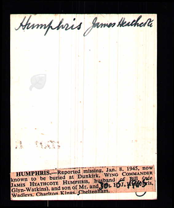 | ‑1 | Sybil (Bill) Glyn-Watkins | Wing-Cdr James Heathcote Humphris (Jul 1915 – 8 Jan 1945, Dunkirk) (m 6 Jun 1940) secret mission son of Henry James Humphris and Irene Margaret Todd (née Heathcote) Humphris |
