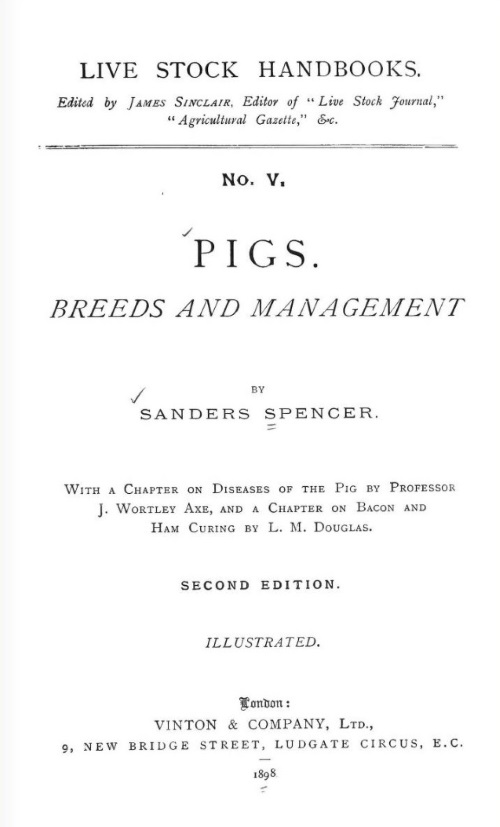 But towards the end of his professional career, Sanders Spencer too had distilled many decades of experience in the breeding and rearing of pigs into a volume entitled Pigs: Breeds and Management. However it is uncertain as to whether the contents of this authoritative treatise ever came to the attention of the notoriously feather-brained ninth Earl.