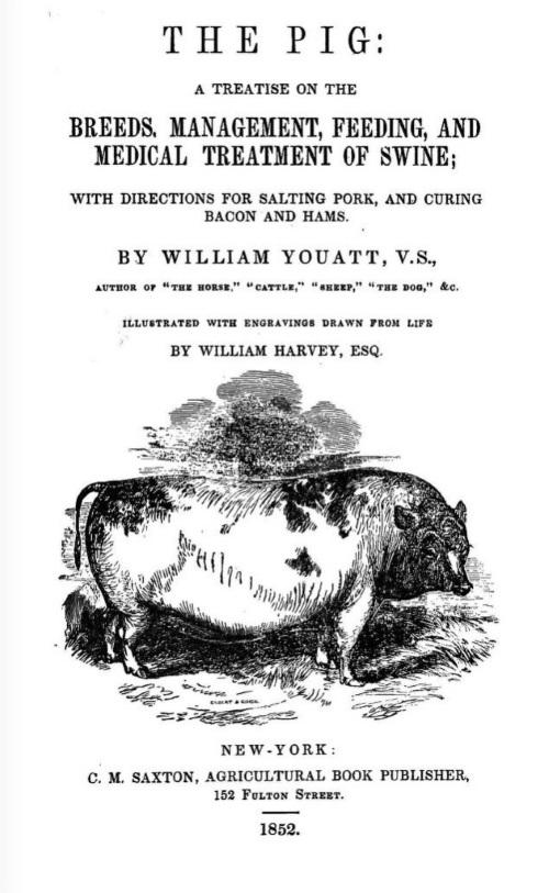 There was a remarkable coincidence in date of publication of these two entirely independent works – both first appeared in 1898, although Whiffle brought out a second edition in 1915. In both volumes, he disparaged the contributions of Youatt et al to the subject, going so far as to accuse them of plagiarism even though Youatt himself had posthumously brought out a highly-regarded volume, The Pig: a Treatise on the Breeds, Management, Feeding, and Medical Treatment of Swine; with Directions for salting Pork and curing Bacon and Hams, as far back as 1847.