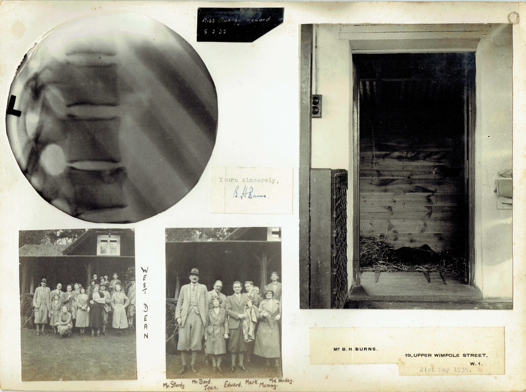 From sheet #1, her anxious parents clearly consulted a Mr B H Burns of 19 Upper Wimpole Street, a favoured haunt of expensive medical or dental practitioners, and there’s a cutting of his headed notepaper dated 21 May 1935, following the initial X-ray. In the meantime however, Audrey was able to photograph a family group$, including her uncle Edward James, at West Dean. Admittedly, there’s also a picture of a vertiginous drop, which would do nobody any good whatsoever.