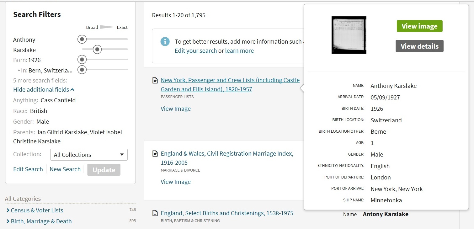 It would be nice to see the Swiss birth certificate (in the name of Antoine Karslake), and the English adoption certificate (coincidentally, such official certification was just being inaugurated at the time in question) in the name of Anthony Karslake.