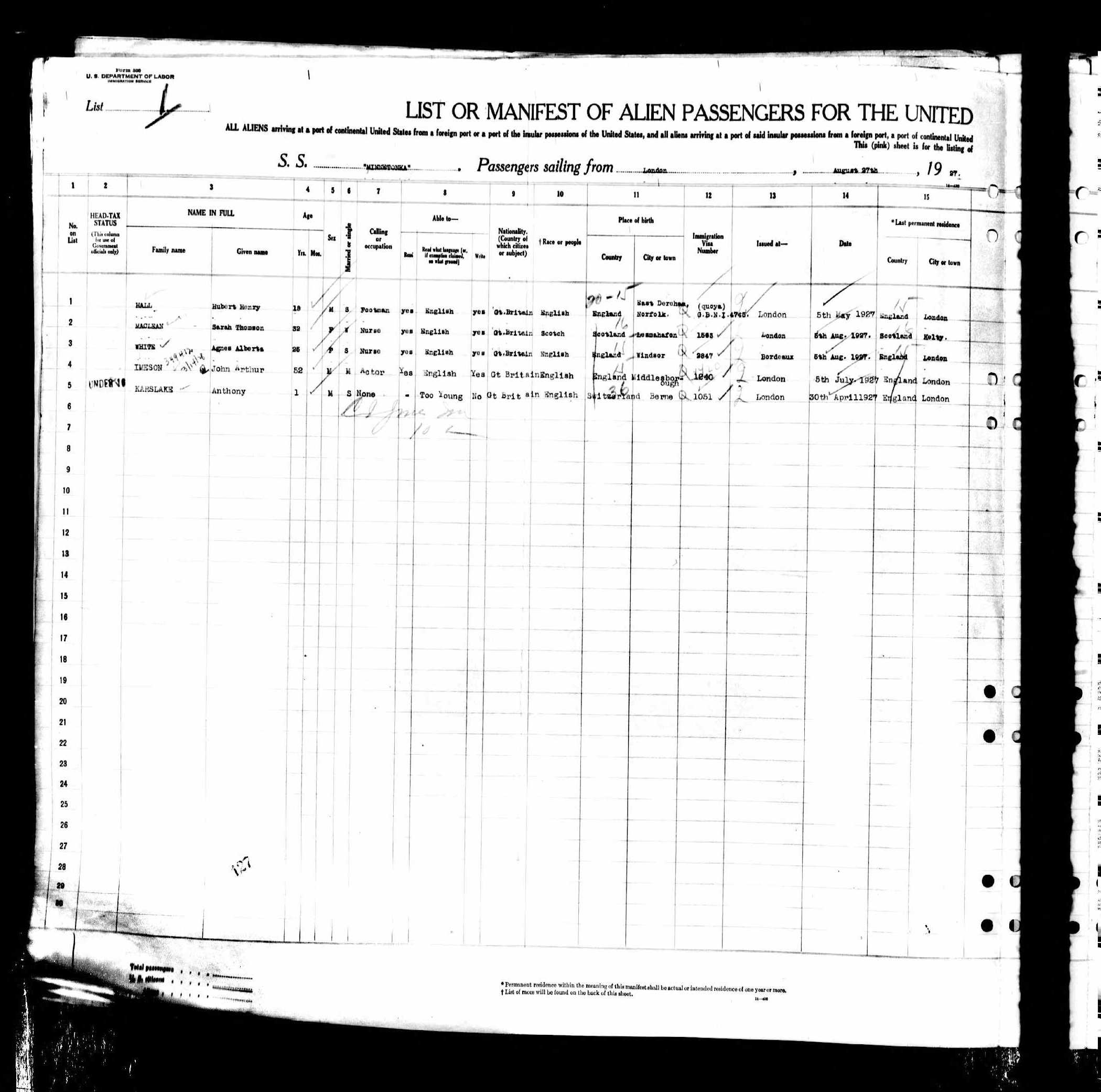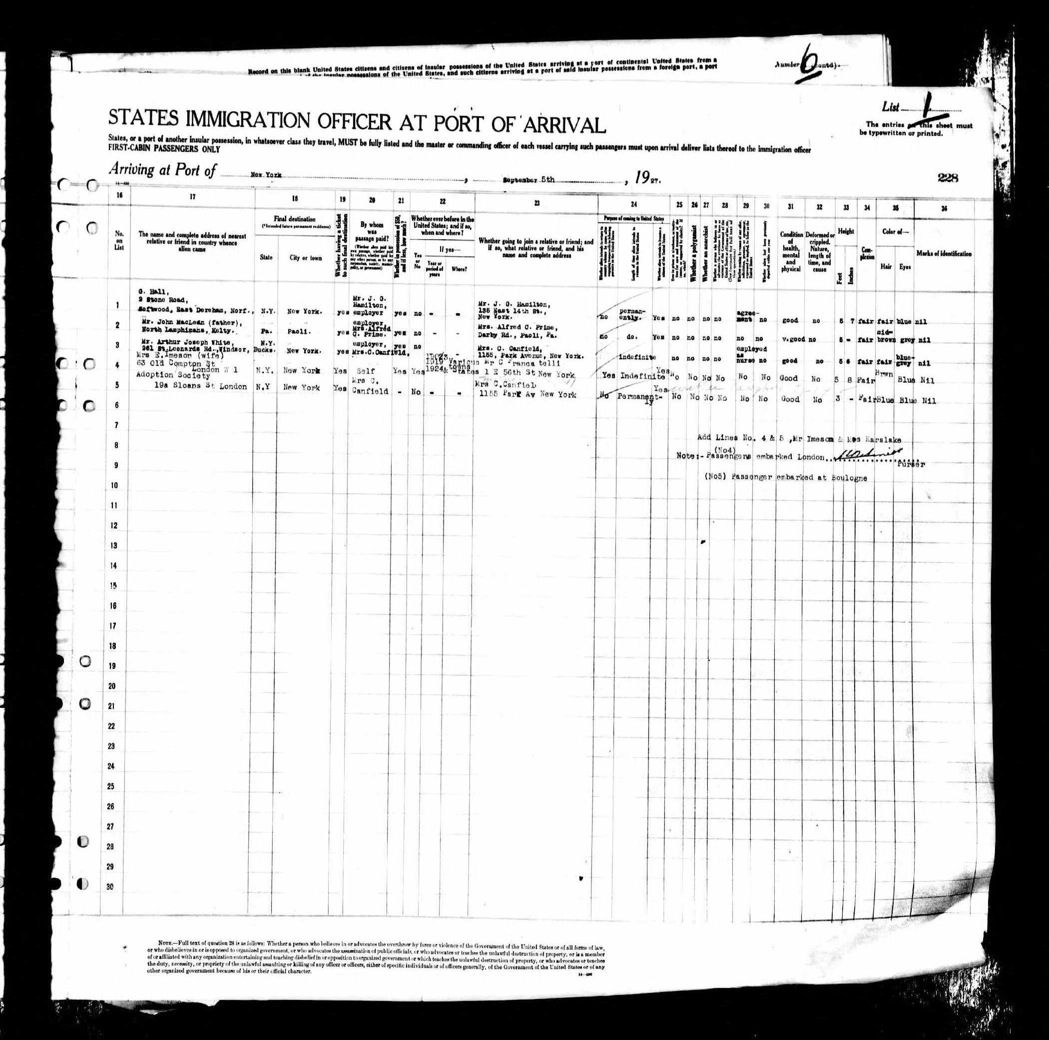 Though these could certainly be tracked down, the document that has really convinced me is the passenger manifest of the ocean liner that conveyed the infant Anthony Karslake, in the care of a trusty nurse, Mrs Agnes White, from London to New York in September 1927, on behalf of Mrs C (Cass) Canfield of 1155 Park Avenue, New York. Mrs Canfield's husband, Cass Canfield, a multimillionaire publisher, was based in London for much of the year, and had himself made all the arrangements.