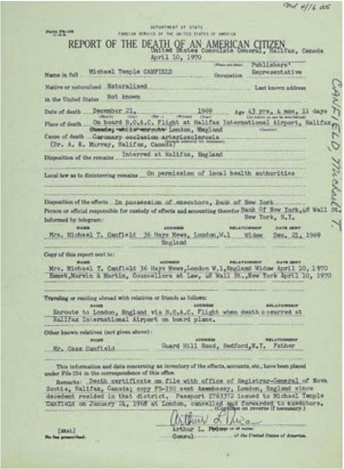 Remarks: Death Certificate on file with office of Registrar-General of Nova Scotia, Halifax, Canada; copy FS-192 sent Am Embassy, London, England since decedent resided in that district. Passport Z763372 issued to Michael Temple Canfield on January 24, 1968 at London, cancelled and forwarded to executors.
