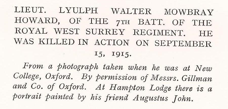 But oddly enough, the IWM [Imperial War Museum] website reveals that a Lt Henry Charles Mowbray Howard was also killed in action, just a fortnight later than Lt Lyulph Walter Mowbray Howard.