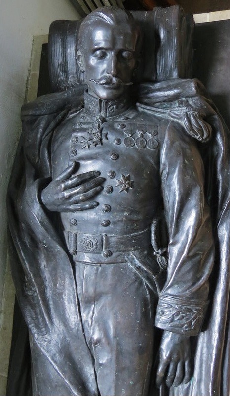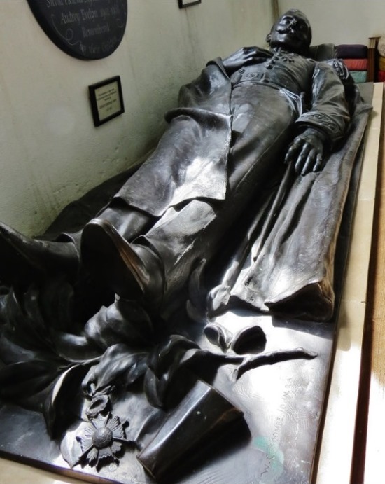 The Church of St Andrew, West Dean, together with its burial ground, lies within West Dean gardens. And against the wall of the south transept, there is a very fine leaded bronze effigy of William Dodge James, as shown in the photograph below.