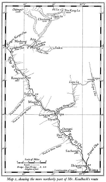 Kaulback had first met Kingdon Ward at the Royal Geographical Society whilst he was learning various techniques required for surveying in the field. When asked to provide a character reference Kaulback's old tutor at Pembroke College, Cambridge, memorably wrote back saying: "I have known Kaulback well through three tumultuous years at this College, and can confidently recommend him to you as an explorer-companion, or as a buccaneer, or probably best of all as the president of a South American republic." ... Undeterred (or perhaps inspired) by this quixotic recommendation Kingdon Ward took him on. As Kingdon Ward later wrote in his introduction to Kaulback's first book, Tibetan Trek (1934): "I was impressed by his sound common sense and his anxiety to take work off my shoulders. Nor did he shirk responsibility. For the first few days after we left civilization, I was worried about him. Had I made a mistake? But I need not have alarmed myself. From Rima onwards, when he had work of his own to do, he began to shape into the real thing. His work was astonishingly accurate and neat. Above all he was thorough. He took an interest in everything, and was an excellent companion. I never wish a better."