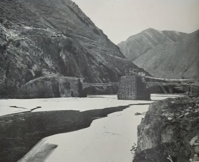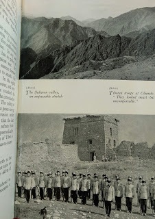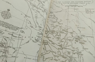"Near the north-eastern corner of Burma the mountains seemed to be trying to strangle three great rivers, the Yangtze, the Mekong and the Salween. Beyond that the rivers spread out in a fan, with the Salween as left-hand or Western rib. Together they drained an enormous area. Up there, in eastern Tibet nearly everything was marked in dots, both roads and rivers. Several place-names had an interesting note of interrogation after them. Even the mountain ranges were drawn in tentatively, and heights were hardly shown at all. A few routes were definite, routes followed by European travellers. But there was a lot of blank space in between. And, except at two or three points where it had been crossed, the upper course of the Salween where it was called the Nak Chu (Black River), some hundreds of miles in length, was entirely conjectural."