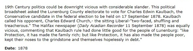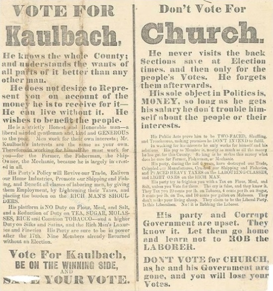 In the 1867 election, Henry Adolphus Newman Kaulback had lost heavily to Edmund Mortimer McDonald, who was succeeded by Charles Edward Church in the 1872 and 1874 elections. Charles Edwin Kaulback now sought to avenge his brother in the 1878 election, and the gloves were really and truly off this time, as can be seen from his electoral poster. These bare-knuckle tactics won him the seat with a resounding majority.