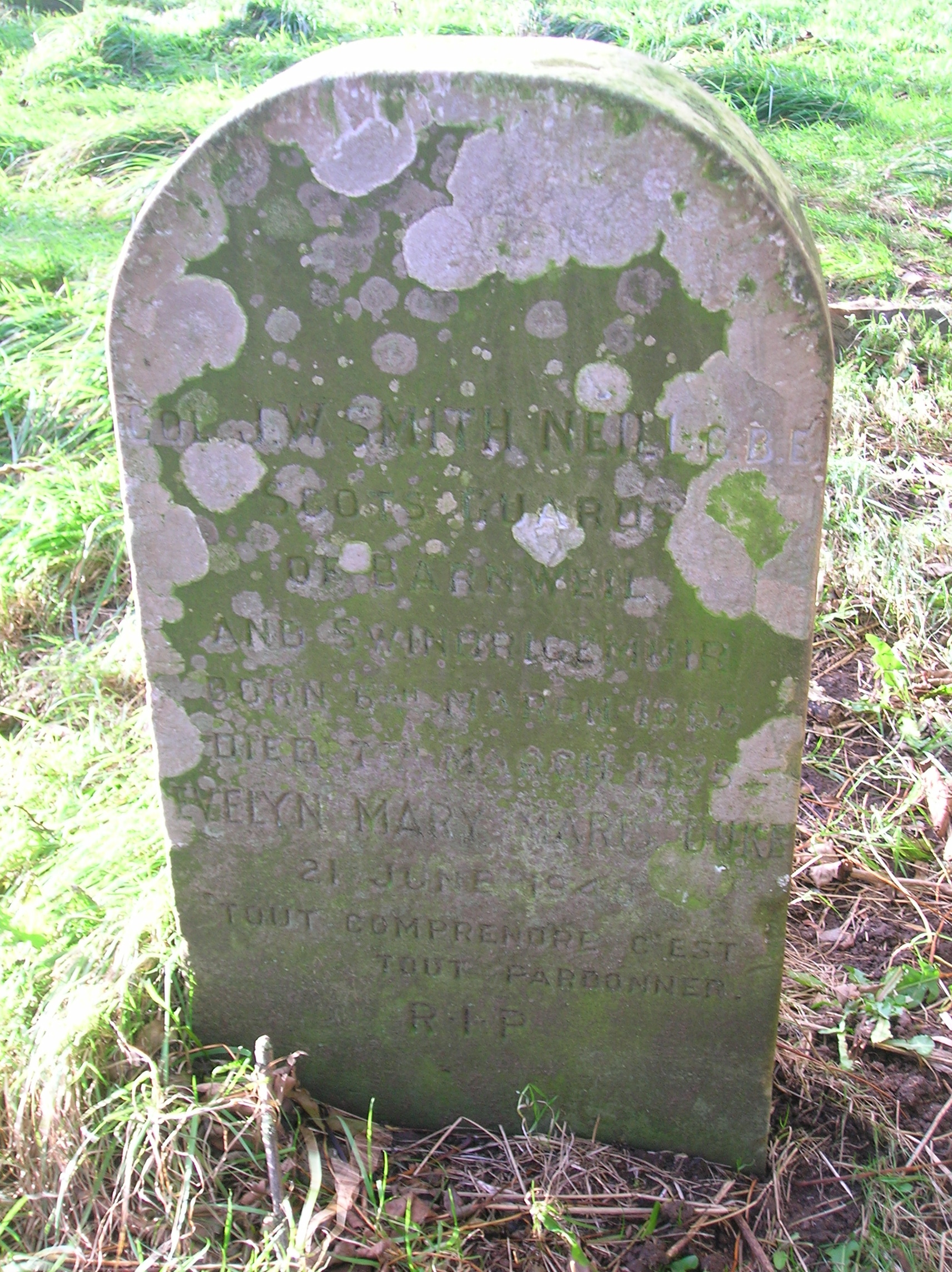 In 1857, after the death of his father at Lucknow, Captain William James Smith-Neill of Barnweill, Swinridgemuir, and Kersland R.A. (?) inherited the estates amounting to around 1275 acres. His son was James William Smith-Neill. In 1874 Captain W. J. Smith Neill was the owner of Swindridgemuir estate. J. W. Smith Neill CBE born in 1855, died in 1935 and his wife Evelyn died in 1947, both are buried in the Barnweil churchyard.”| # | Individual | Spouse / Partner | Family |