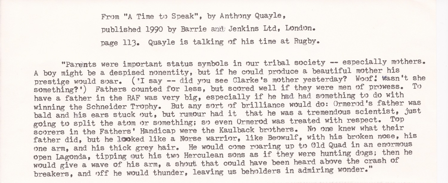 Sir Anthony Quayle, later a distinguished actor and director, was born in 1913, and was a year below Bill Kaulback at Rugby, who was himself a couple of years below Ron. In his autobiography he recalled the uniquely dramatic impact of Harry Kaulback delivering the Kaulback brothers back to school (after an exeat, by the sound of it) and the unparalleled street-cred they accrued on every such occasion.