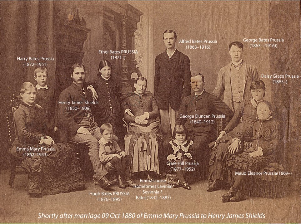 Kendall's guess is that this photograph was taken about two years after the wedding on 9 Oct 1880 between Emma Mary Prussia (1862–1943) and Henry James Shields (1850–1909).