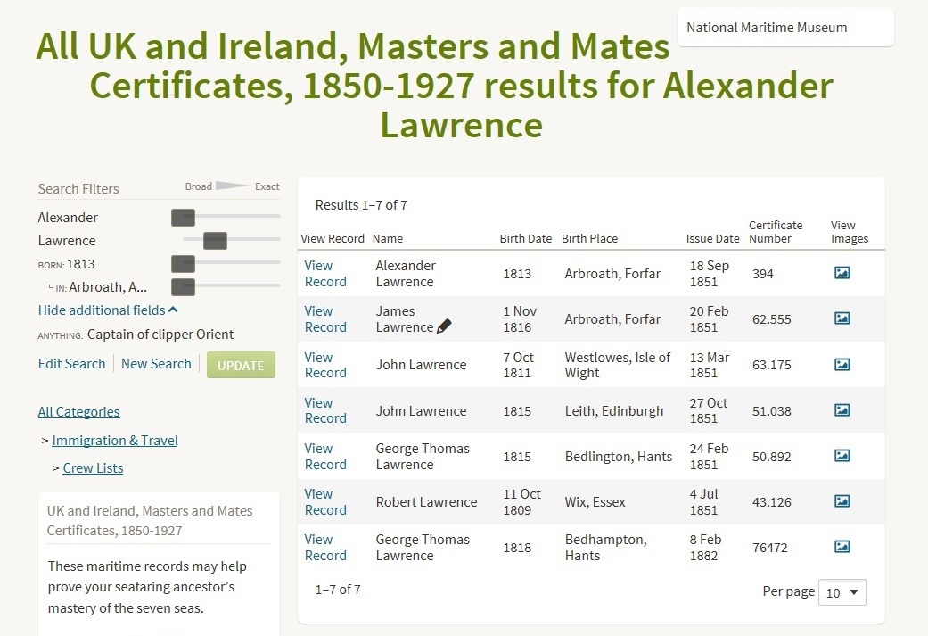 What has emerged, however, is the issue of his Master's Certificate #394 from the Board of Trade's1, 2 office at Arbroath on 18 Sep 1851, though unfortunately there is no surviving image of the document.