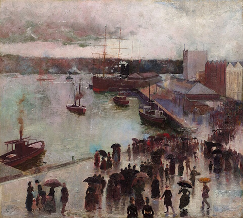 I'm rather puzzled by the next picture, as it was painted in 1888 and depicts the Circular Dock, a feature of Sydney rather than Adelaide. The youthful Conder was indeed working in Sydney at the time, as an artist for the "Illustrated Sydney News", but Orient was no longer sailing to Australia at all, let alone to Sydney rather than Adelaide. And indeed his bohemian private life (he was busy in the bedroom with his landlady at that time), is hard to reconcile with any likely interest in merely maritime goings-on (nautical rather than naughty, fnarr fnarr).