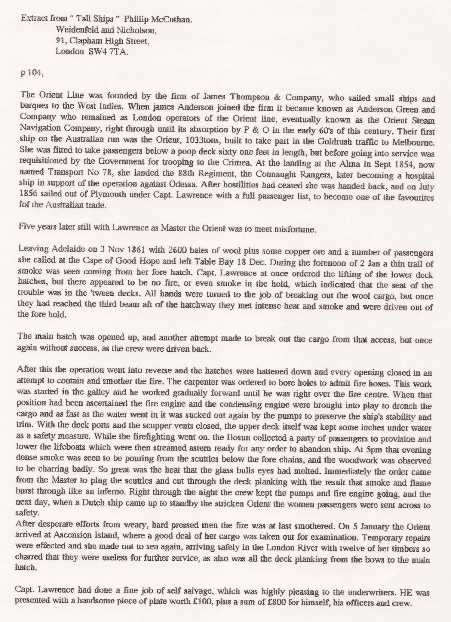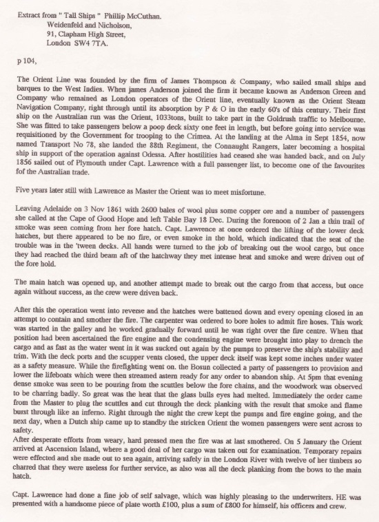 Alexander Lawrence was Captain of the Orient for a total of five round trips from England to Australia, the last of which was marked on the return by the fire that he dealt with so expertly. These voyages have been tabulated, amongst much else, in a truly fascinating book: